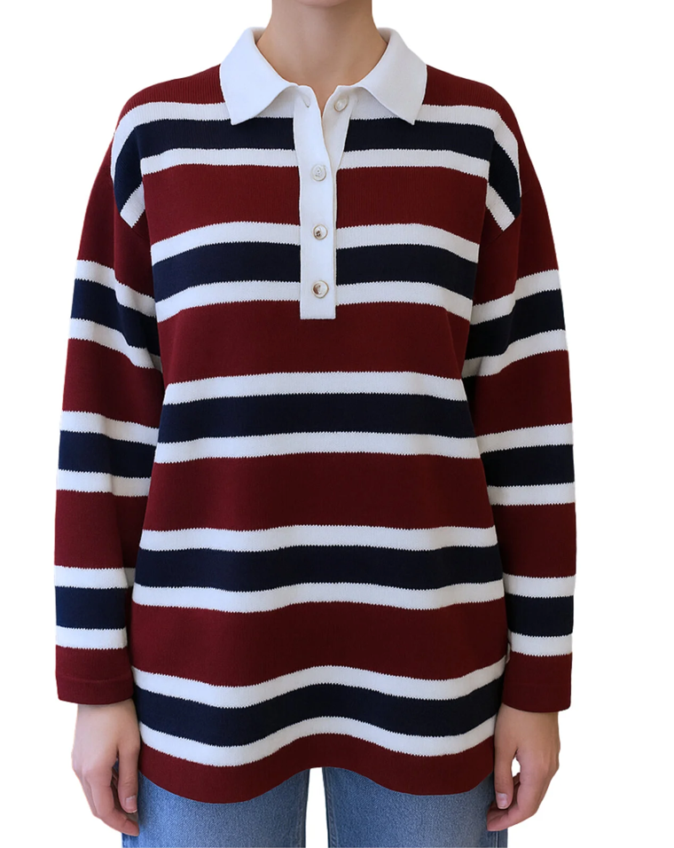 Kadın Polo Yaka Çizgili Basic Triko Kazak